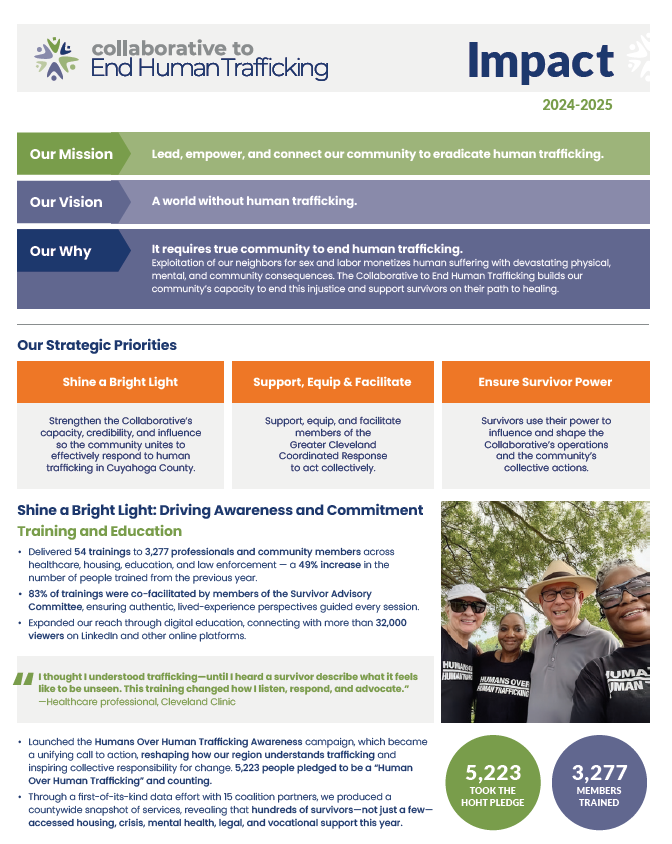 Preventing human trafficking requires a community that is informed, connected, and equipped to act early. This year, partners across Greater Cleveland continued to build those conditions — and the Collaborative helped strengthen the systems that make coordinated prevention possible. Survivor leadership expanded, cross-sector collaboration deepened, and more people gained the tools to recognize early signs of risk.